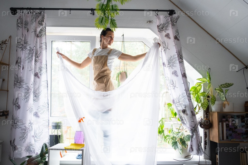 Женщина в фартуке вешает прозрачные тюльские шторы на большие чердачные окна в доме внутри интерьера с горшечными растениями. Весенняя уборка, уборка