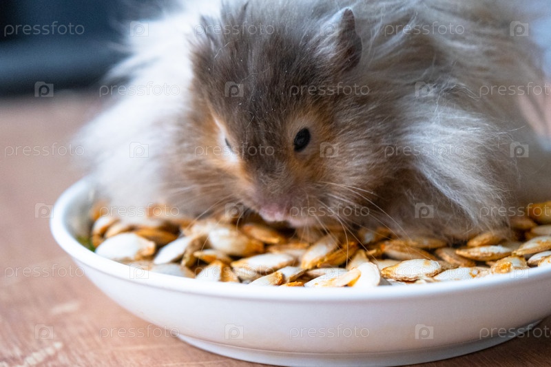Забавный пушистый сирийский хомяк сидит на горстке семян и ест и набивает щеки припасами. Питание для грызунов, витамины. Закрытие