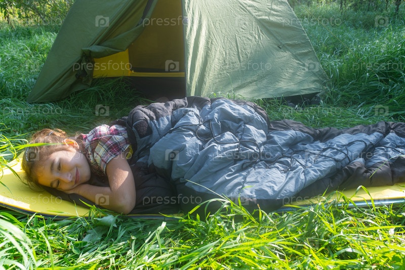 Девушка лежит в спальном мешке на теплом коврике возле палатки на открытом воздухе. Семейный кемпинг, походное снаряжение
