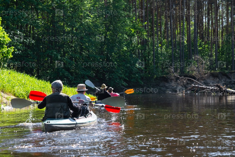 Групповая поездка на байдарках для сеньора и сеньоры. Пожилая пара и взрослая гребная лодка на реке, поход по воде, летнее приключение. Возрастные виды спорта, умственная молодость и здоровье, туризм, активная старость