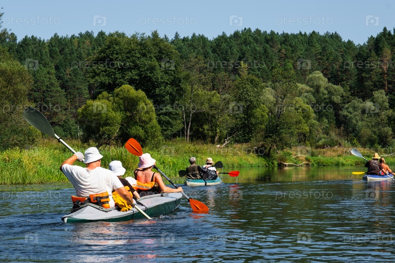 Семья с детьми на рафтинге в групповом каяк-путешествии разного возраста, взрослых, пожилых людей. Гребная лодка на реке, водный поход, летние приключения