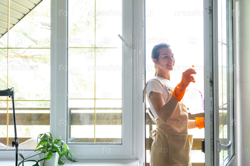 Женщина в резиновых перчатках и фартуке вручную моет оконный балкон дома тряпкой и шваброй внутри интерьера. Восстановление порядка и чистоты весной, уборка сервиза