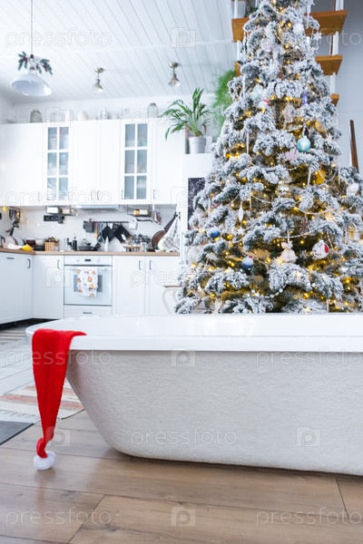 Новая ванна под праздничной елкой в качестве новогоднего подарка в интерьере белой современной декорированной кухни. Реконструкция и дизайн интерьера, строительство и улучшение дома
