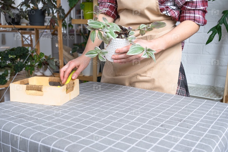 Пересадка и уход за домашним растением в новый домашний интерьер горшка. Женщина выращивает растения хобби, держит полезные растения