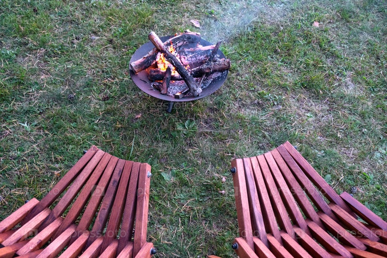 Металлическая огненная чаша с горящей древесиной во дворе и садовая стойка палубных кресел. Безопасная декоративная огненная яма, Пикник в саду