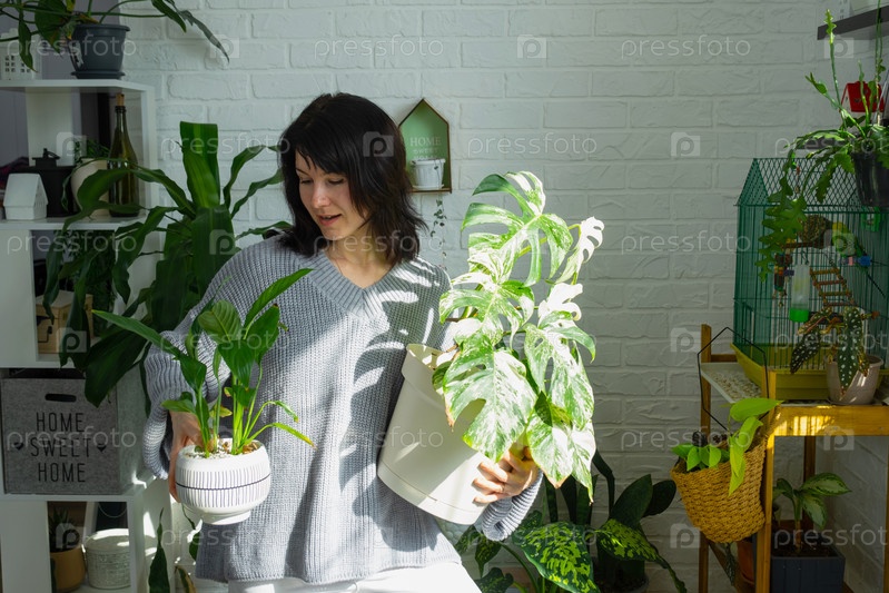 Женщина держит дома растение редкого варегатного монстра Альба в горшке в домашнем интерьере