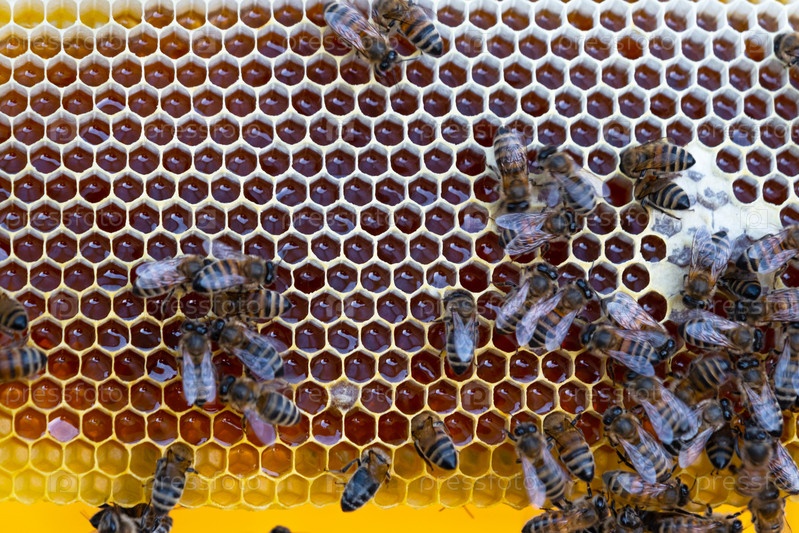 Пчелы сидят на сотах с медом в пчелиной раме крупным планом. Пчеловодство, уплотнение сот с воском и заливка меда, разведение и содержание пчел