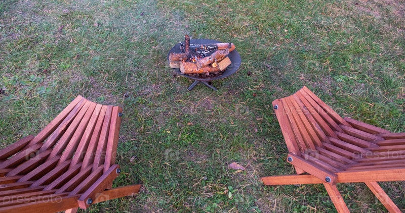 Металлическая огненная чаша с горящей древесиной во дворе и садовая стойка палубных кресел. Безопасная декоративная огненная яма, Пикник в саду