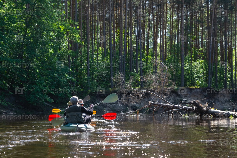 Групповая поездка на байдарках для сеньора и сеньоры. Пожилая пара и взрослая гребная лодка на реке, поход по воде, летнее приключение. Возрастные виды спорта, умственная молодость и здоровье, туризм, активная старость