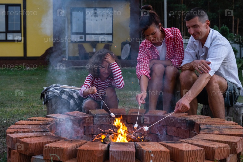 Семья мама, папа, дочь жарят зефир на шашлыках на костре в очаге во дворе дома у пожарной ямы уютным летним вечером
