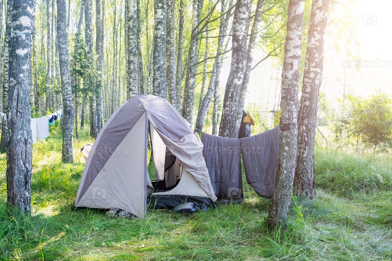 Установлена туристическая палатка в кемпинге на природе в лесу. Внутренний туризм, активные летние каникулы, семейные приключения. Экотуризм, спорт, поход. Копировать пространство, высмеивать
