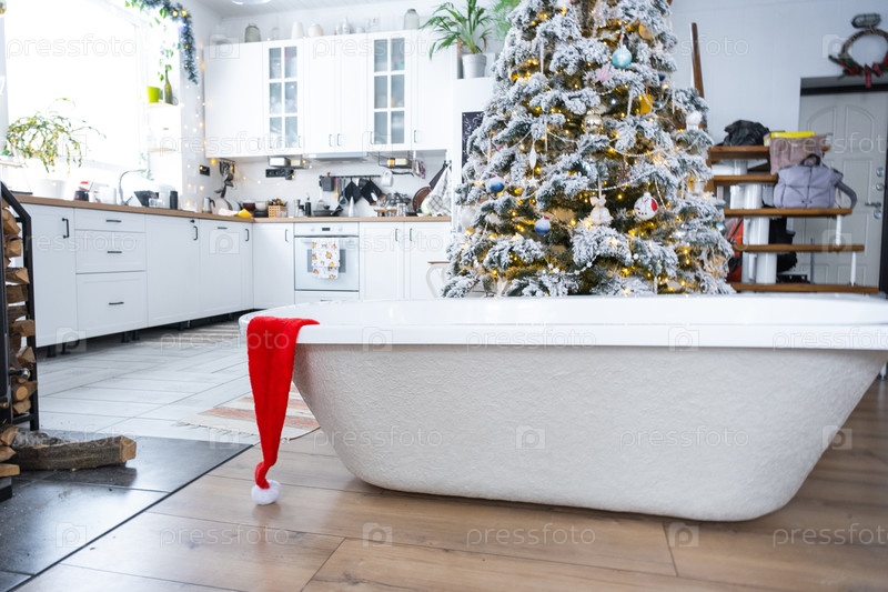 Новая ванна под праздничной елкой в качестве новогоднего подарка в интерьере белой современной декорированной кухни. Реконструкция и дизайн интерьера, строительство и улучшение дома