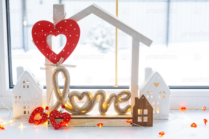 Ключ к крошечному дому уютного дома с декором Валентина на подоконнике. Подарок на день валентинок, семейное гнездо любви. дизайн, проект, переезд в новый дом, ипотека, аренда и покупка недвижимости
