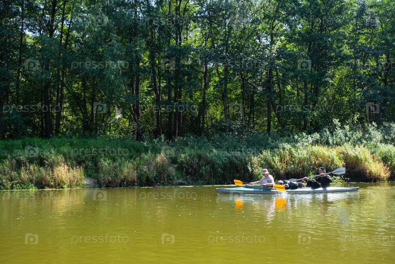 Семейная поездка на байдарках для сеньора и сеньоры. Пожилая супружеская пара гребля на лодке по реке, поход по воде, летнее приключение. Возрастные виды спорта, умственная молодость и здоровье, туризм, активная старость