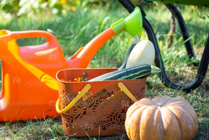 Сбор овощей в саду, тыквы, кабачков, помидоров, моркови в корзине рядом с поливной банкой и садовой тележкой. Праздник урожая, подарки осени, выращивание экологически чистых продуктов