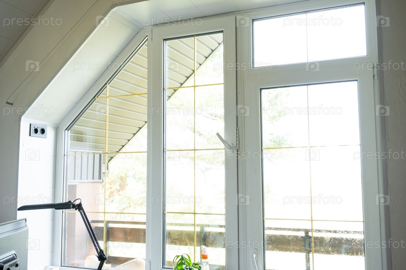 Оконный чердак изнутри дома пластиковое стекло с двойным остеклением, чистое стекло после чистки окон, открытое и закрытое окно, оконная фурнитура