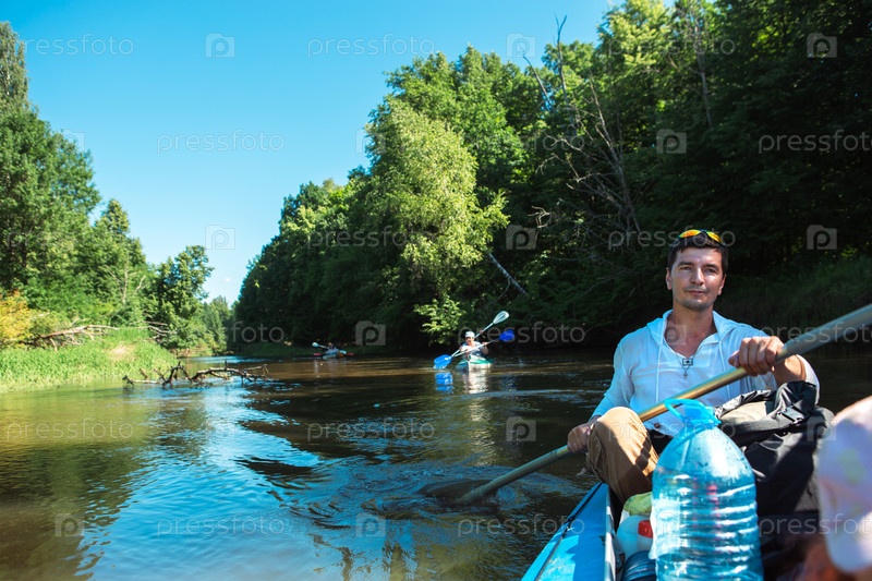 Семейная поездка на байдарках. Отец и дочь, а также пожилая пара старшая и старшая гребная лодка на реке, водный поход, летнее приключение. Экологичный и экстремальный туризм, активный и здоровый образ жизни