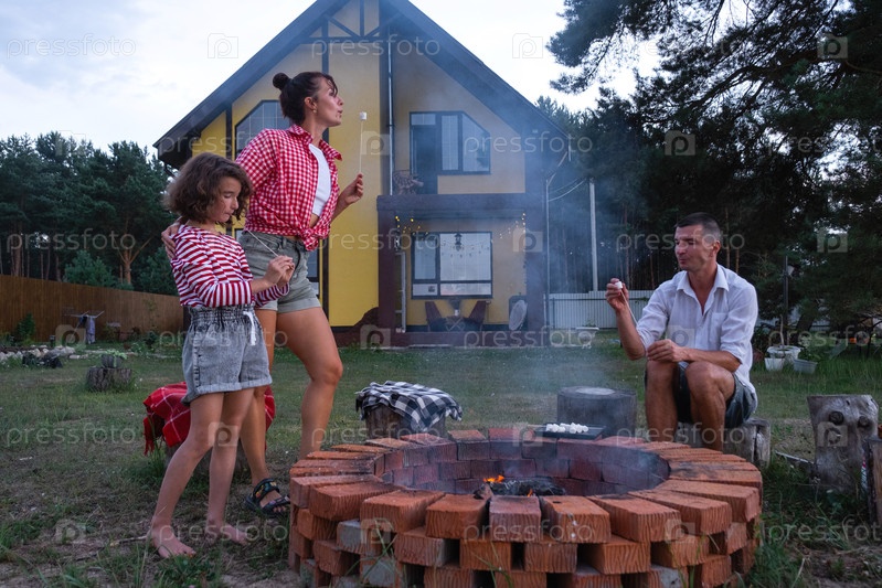 Семья мама, папа, дочь жарят зефир на шашлыках на костре в очаге во дворе дома у пожарной ямы уютным летним вечером