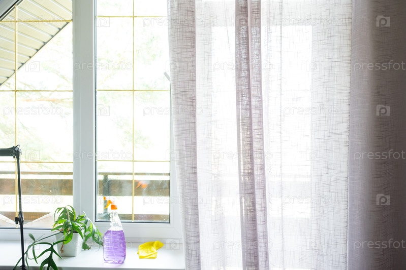 Оконные чистящие средства лежат на подоконнике тряпкой, спреем, моющим средством. Весенняя уборка в доме, уборка
