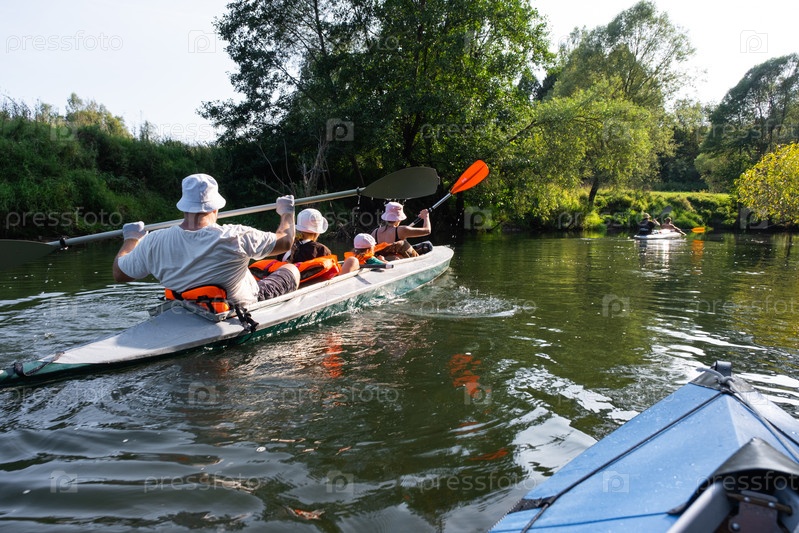 Семья с детьми на рафтинге в групповом каяк-путешествии разного возраста, взрослых, пожилых людей. Гребная лодка на реке, водный поход, летние приключения