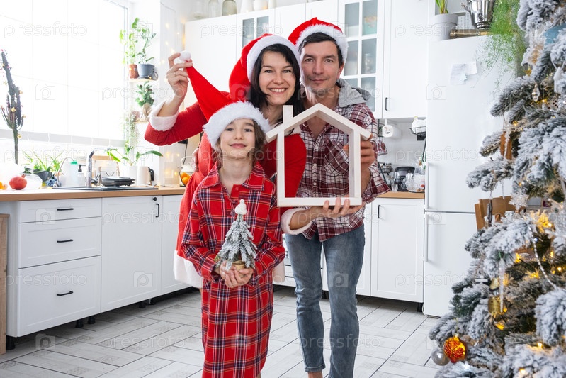 Счастливая семья в шляпах санта с крошечным домом в уютном доме с рождественским декором праздничной белой кухни. Подарок на Новый год. Страхование, переезд в новый дом, ипотека, аренда и покупка недвижимости