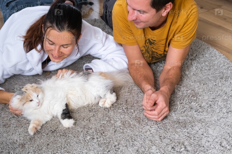 Муж и жена играют с домашним котом на ковре