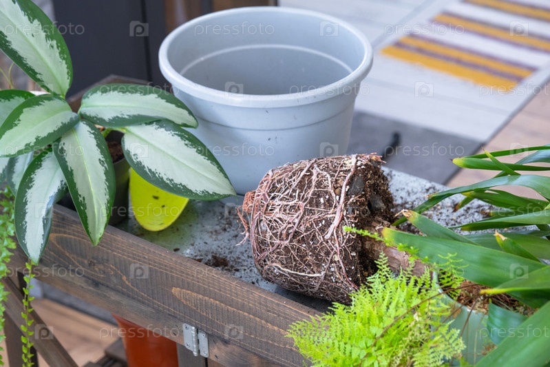 Юкка, аглаонема, папоротник на столе для пересадки и ухода за домашними растениями в интерьере зеленого дома с горшечными растениями