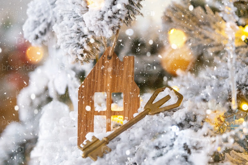 Ключ и крошечный дом в руке на заднем плане сказочной елки. Подарок на Новый год, Рождество. Строительство, дизайн, проект, переезд, страхование, ипотека, аренда и покупка недвижимости