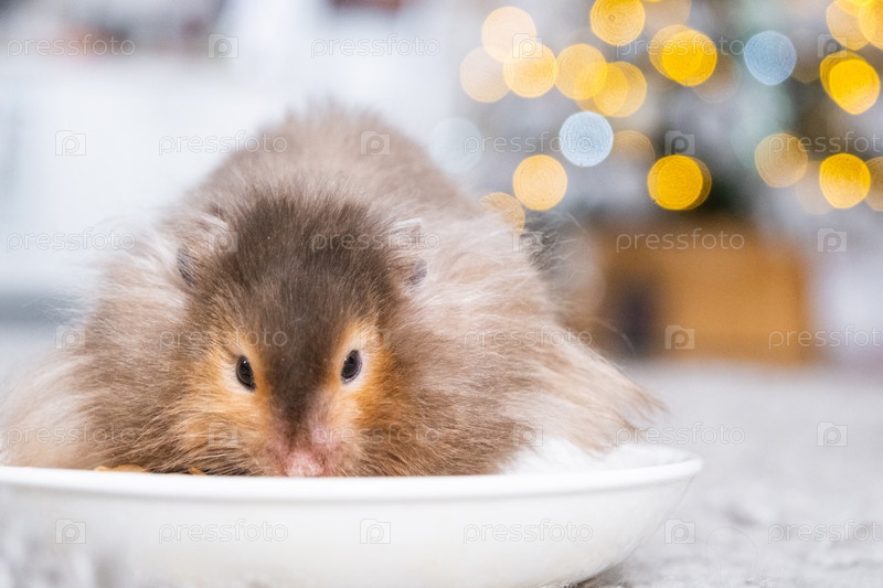 Забавный лохматый пушистый хомяк, сидящий в тарелке И ест семена на рождественском фоне с волшебными огнями и боке