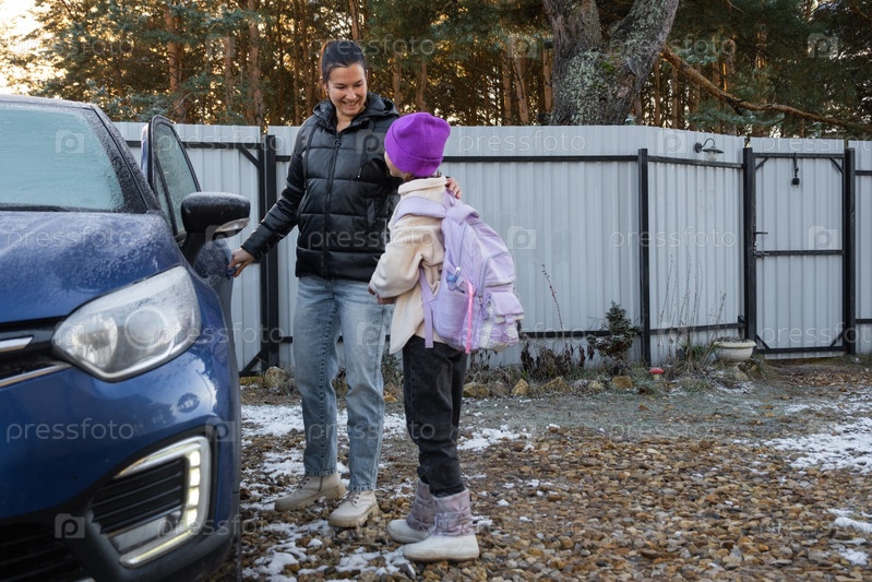 Мама сопровождает и кладет школьницу с рюкзаком в машину, чтобы отвезти ее в школу