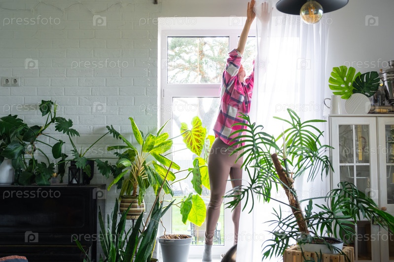 Женщина вешает прозрачные тюльские шторы на большие окна в доме внутри интерьера. Весенняя уборка, уборка