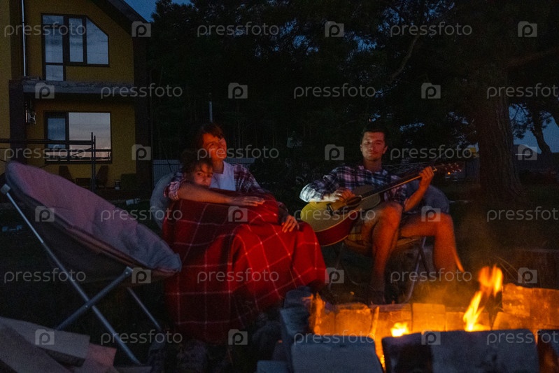 Семья сидит у костра, мужчина играет на гитаре, женщина слушает и поет, дочь завернулась в одеяло. Семейный летний вечер во дворе дома