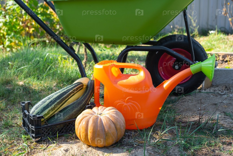 Сбор овощей в саду, тыквы, кабачков, помидоров, моркови в корзине рядом с поливной банкой и садовой тележкой. Праздник урожая, подарки осени, выращивание экологически чистых продуктов
