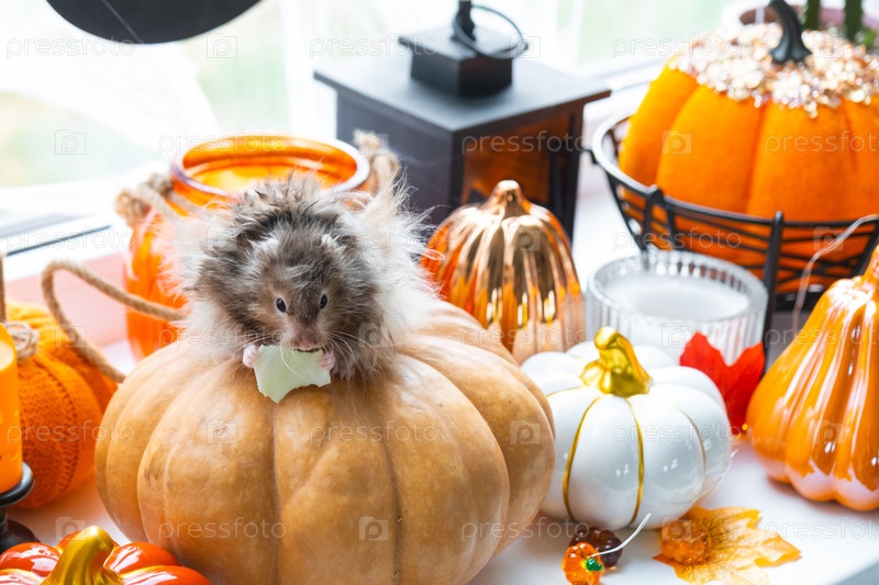 Забавный лохматый пушистый хомяк сидит на тыкве и жует лист в декоре Хэллоуина среди гирлянд, фонарей, свечей. Фестиваль урожая