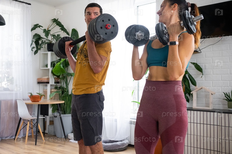 Женщина и мужчина в спортивной форме занимаются фитнесом и силовыми тренировками со штангой и гантелями дома в интерьере и котом