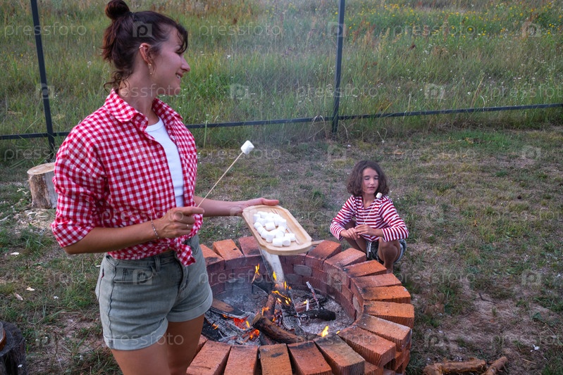 Женщина держит зефир на подносе, чтобы жарить с дочерью на костре на круглом кирпичном костре во дворе дома