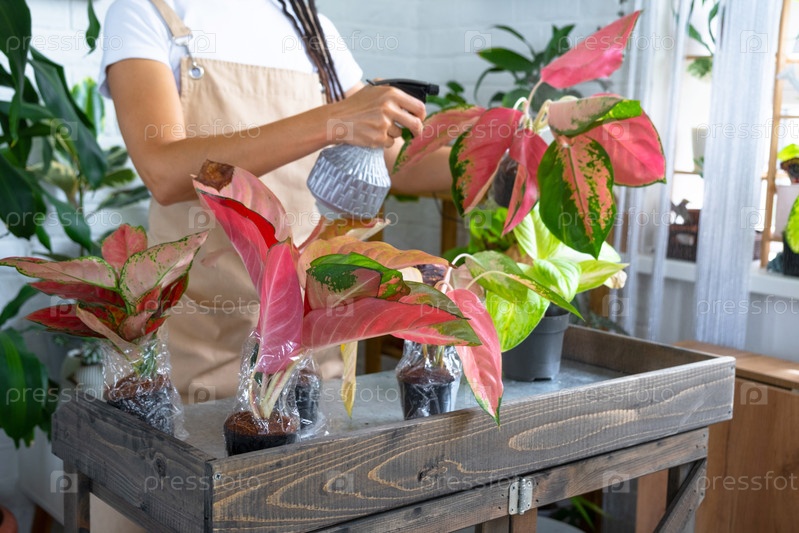 Женщина-флористка распыляет из распылительного пистолета домашние растения аглаонема, жидкое удобрение, борьба с вредителями. Домашнее растениеводство, зеленый дом, водный баланс, увлажнение