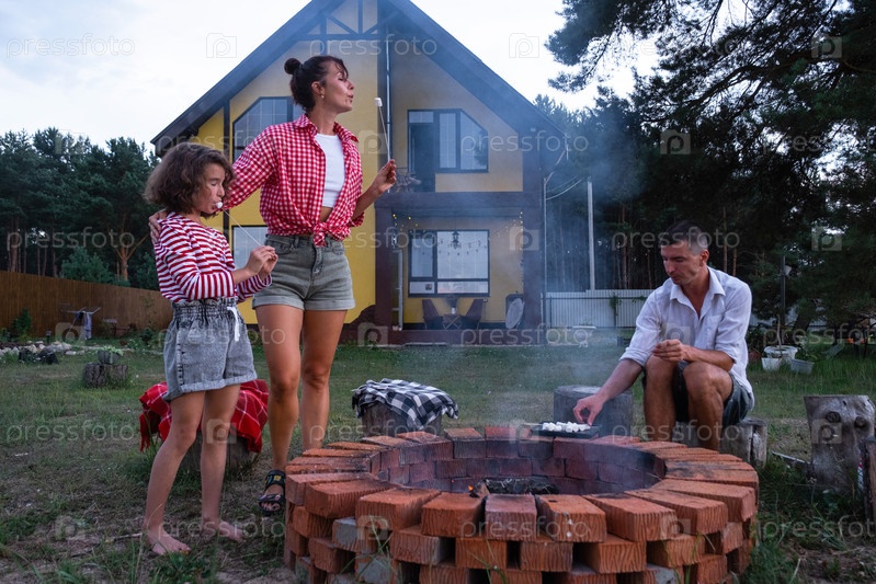 Семья мама, папа, дочь жарят зефир на шашлыках на костре в очаге во дворе дома у пожарной ямы уютным летним вечером