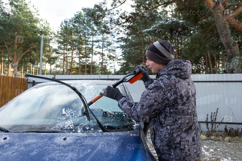 Мужчина очищает лобовое стекло автомобиля ото льда специальной кистью