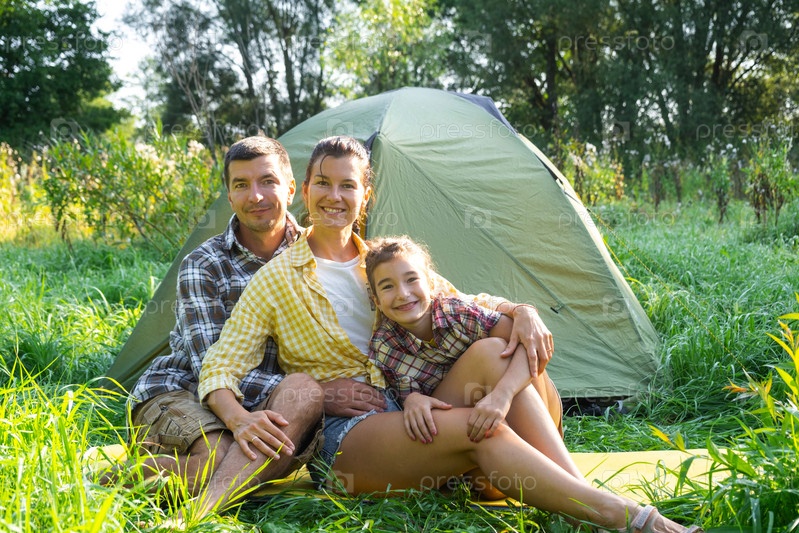 Портрет счастливой семьи, сидящей утром возле палатки для кемпинга на открытом воздухе, кемпинг, семейная походная поездка