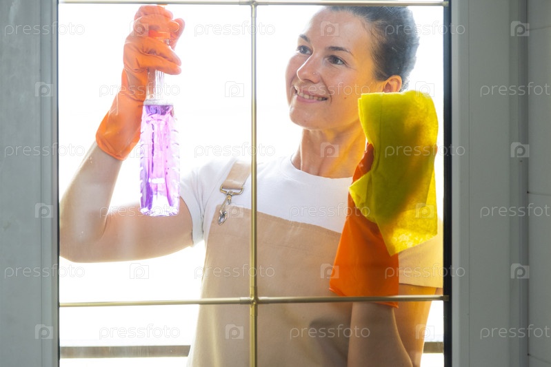 Женщина в резиновых перчатках и фартуке вручную моет оконный балкон дома тряпкой и шваброй снаружи за стеклом. Восстановление порядка и чистоты весной, уборка сервиза