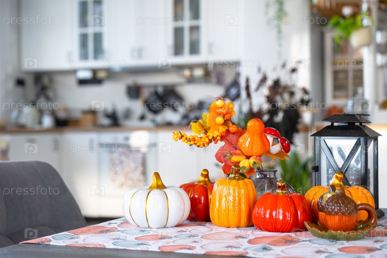 Декор белой классической кухни с тыквами, гирляндами, осенним букетом с желтыми листьями на Хэллоуин и урожай. Осеннее настроение в домашнем интерьере, современный стиль лофта. недвижимость, страхование, ипотека