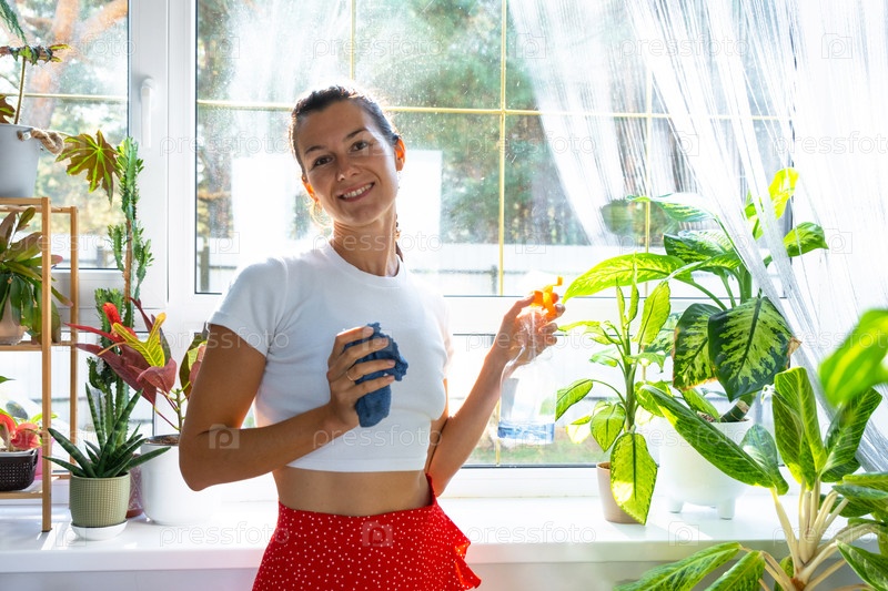 Портрет Женщина с моющим средством, вручную моет окно дома тряпкой и шваброй внутри интерьера с домашними растениями. Восстановление порядка и чистоты весной, уборка сервиза