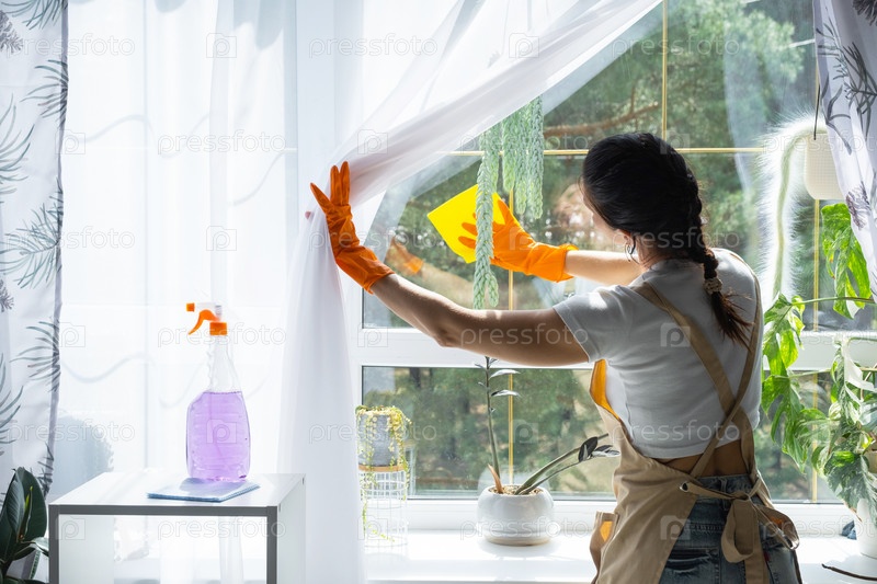 Женщина в резиновых перчатках и фартуке вручную моет окно дома тряпкой и шваброй внутри интерьера с домашними растениями на подоконнике. Восстановление порядка и чистоты весной, уборка сервиза