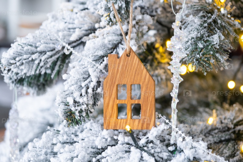 Ключ и крошечный дом в руке на заднем плане сказочной елки. Подарок на Новый год, Рождество. Строительство, дизайн, проект, переезд, страхование, ипотека, аренда и покупка недвижимости