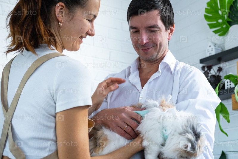 Ветеринар дома проверяет здоровье перевязанной кошки в одеяле после операции по стерилизации вместе с женщиной-помощницей