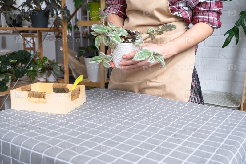 Пересадка и уход за домашним растением в новый домашний интерьер горшка. Женщина выращивает растения хобби, держит полезные растения