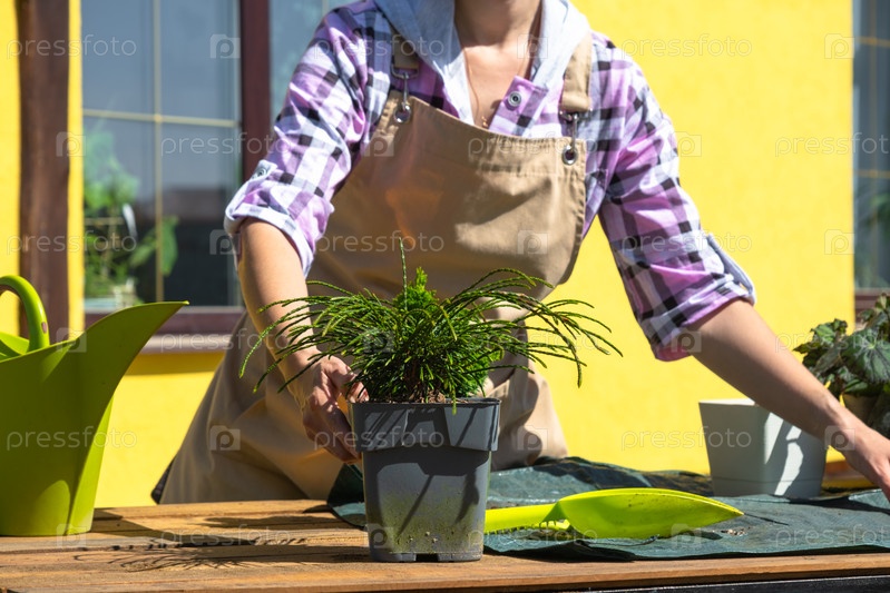Женщина-флористка в фартуке пересаживает наружные хвойные можжевельники для озеленения