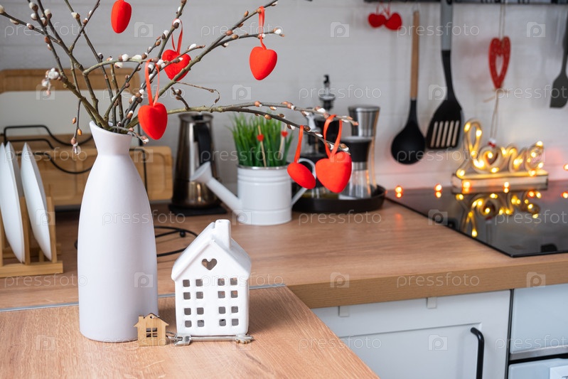 Ключ к крошечному дому уютного дома с декором Валентина на столе кухни. Подарок на день валентинок, семейное гнездо любви. дизайн, проект, переезд в новый дом, ипотека, аренда и покупка недвижимости