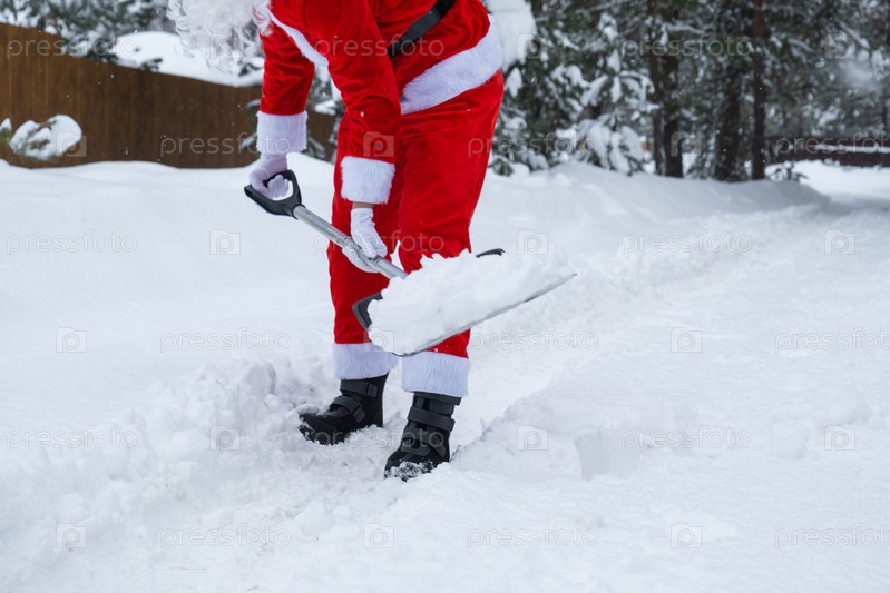 Санта-Клаус очищает снег лопатой зимой на открытом воздухе после снегопада. Уборка улиц в поселке, расчистка проезда для автомобилей, сложные погодные условия на Рождество и Новый год